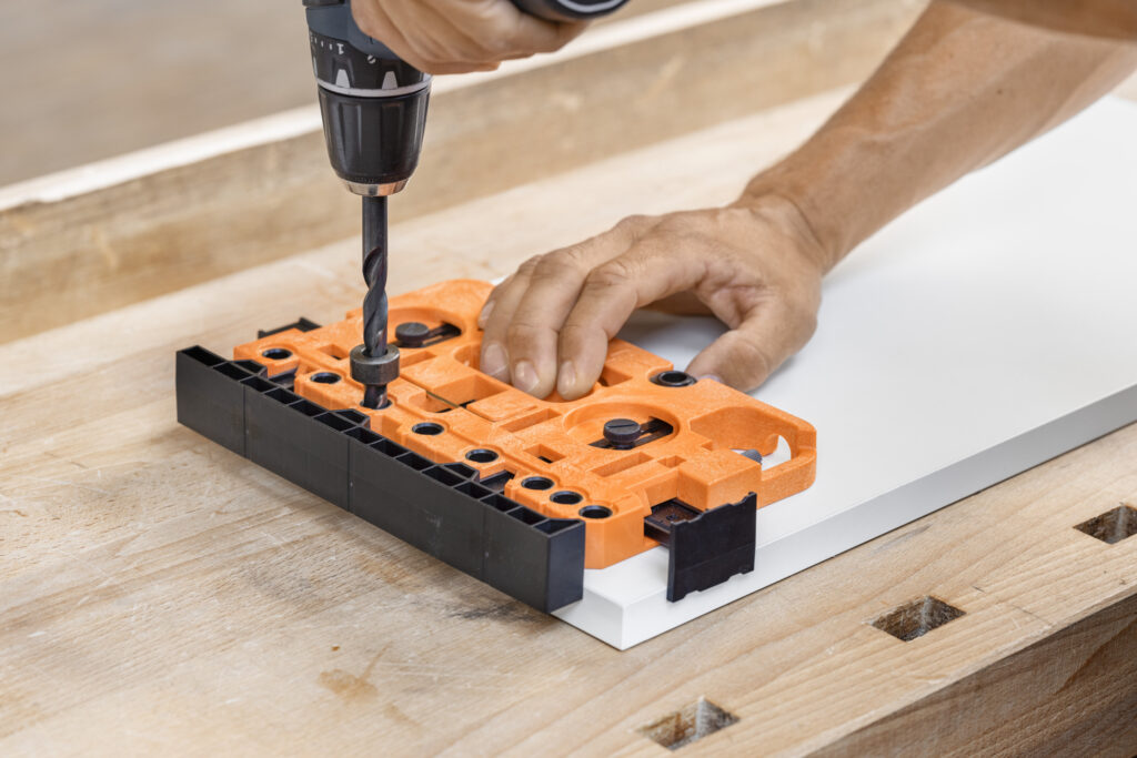 Optimalna pomoč pri obdelavi sprednje stranice, korpusa in predala Z robustnimi pripomočki in univerzalno vrtalno šablono bo točkanje ali predvrtanje pritrdilnih položajev nadvse zanesljivo in natančno.